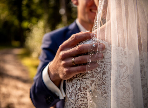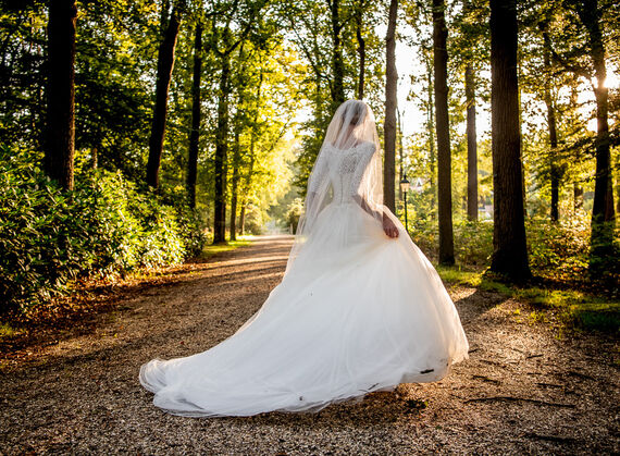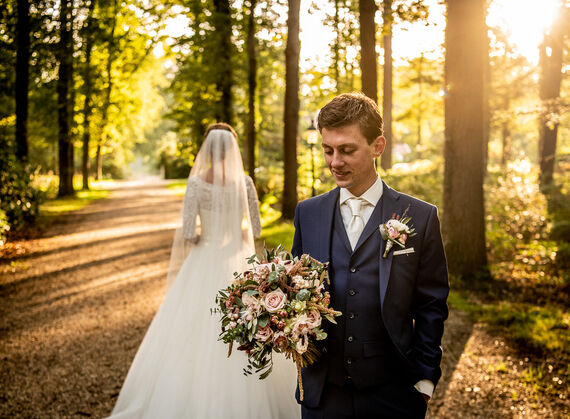 Wat was Anniek prachtig in haar mooie trouwjurk. Toen Anniek zover was hoorden we de auto van Gerben al aankomen. Het is altijd een spannend moment als er op de bel wordt geduwd en het bruidspaar elkaar voor het eerst ziet. Na de eerste ontmoeting gingen we foto's maken in het bos en bij kasteel Staverden. Het was nog wel erg frisjes 's morgens, maar toen eenmaal de zon doorkwam was de temperatuur heerlijk.