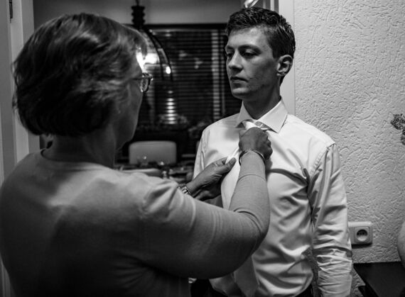 Als eerste mocht ik foto's maken bij Gerben thuis. Daarna ging ik naar Anniek. Daar werden nog de laatste handelingen aan het haar gedaan voordat de trouwjurk aan mocht.