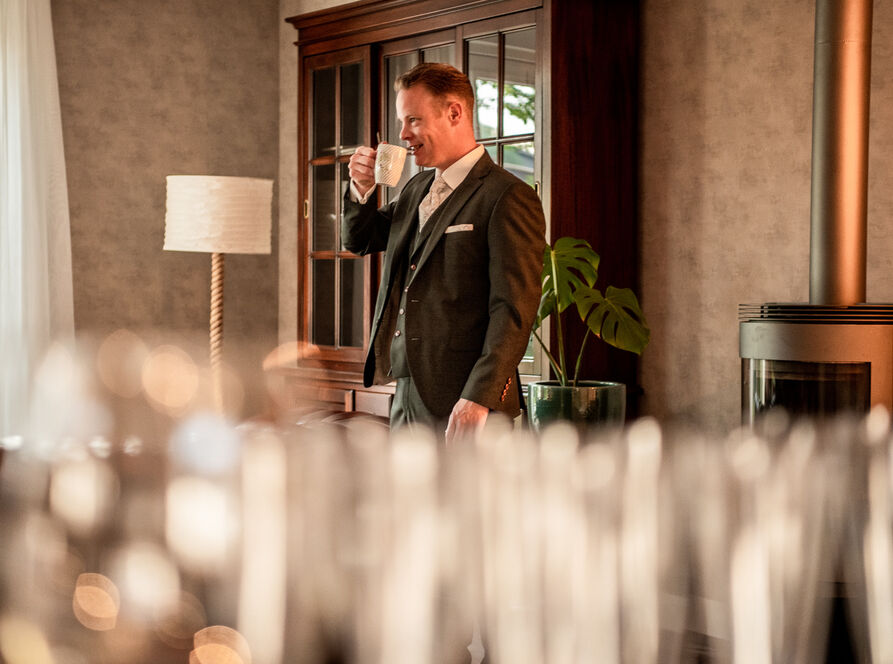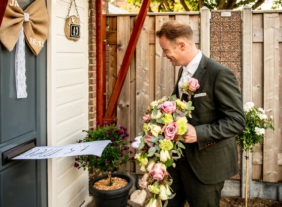 De dag begon voor mij in Putten bij Gert Jan voor het maken van een aantal foto's, om daarna naar Betty te gaan. Bij Betty was haar haar bijna klaar en de jurk kon aan. Alles ging heel relax en toen was het wachten op Gert Jan. Even later kwam Gert Jan eraan, maar voordat hij op de bel ging drukken moest hij eerst nog wat lezen. Betty was zo creatief geweest om een papier te maken van 1,5 meter lang en hiervan was een klein stukje zichtbaar vanuit de brievenbus. in de deur. Nadat Gert Jan alles had gelezen, kwam Betty naar buiten.