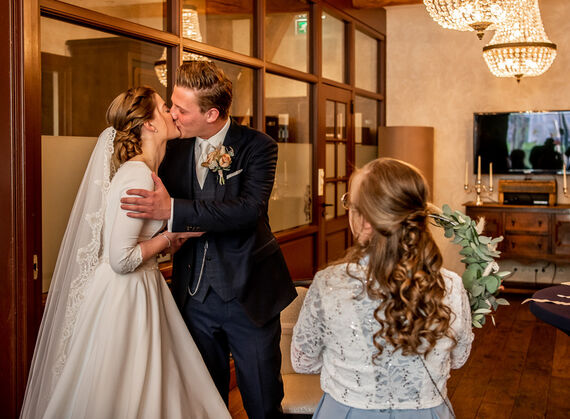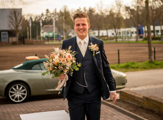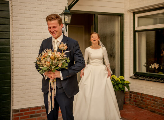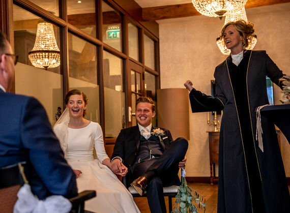 Henk & Bertine hadden als trouwambtenaar Reinolda van Spreken uit Liefde. Als je nog een trouwambtenaar zoekt, is zij echt een aanrader! Zij deed het vol liefde én met humor! Na de ceremonie werden de groepsfoto's gemaakt, daarna was het tijd om te lunchen. Na de lunch trouwden ze in de kerk en daarna was het tijd voor bruidstaart!