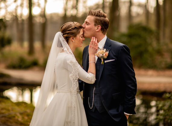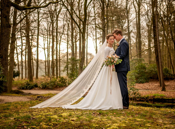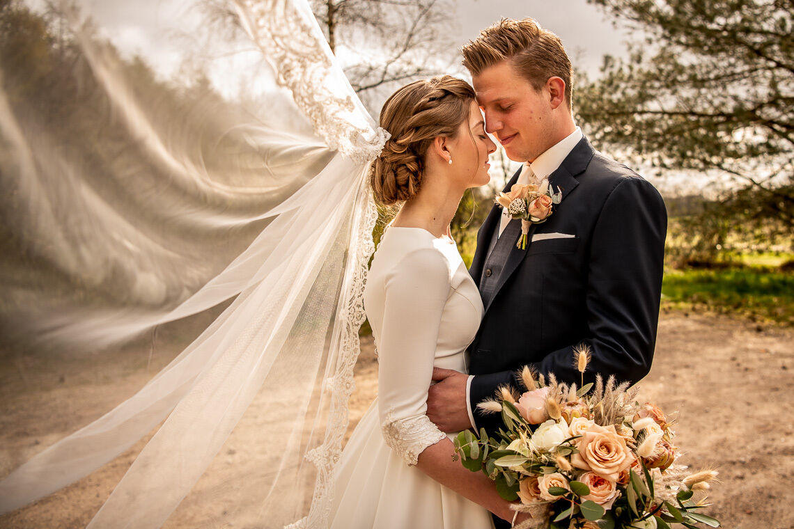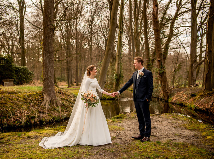 De zon begon al prachtig te schijnen en dat gaf heel mooi licht. De temperatuur was nog niet heel hoog, maar in de zon was het heerlijk. Na de first look gingen we eerst foto's bij Kasteel Staverden in Ermelo maken. Ik ben daar vaker geweest, maar het is daar elke keer weer een prachtig! Je hebt daar genoeg mooie plekjes om foto's te maken.