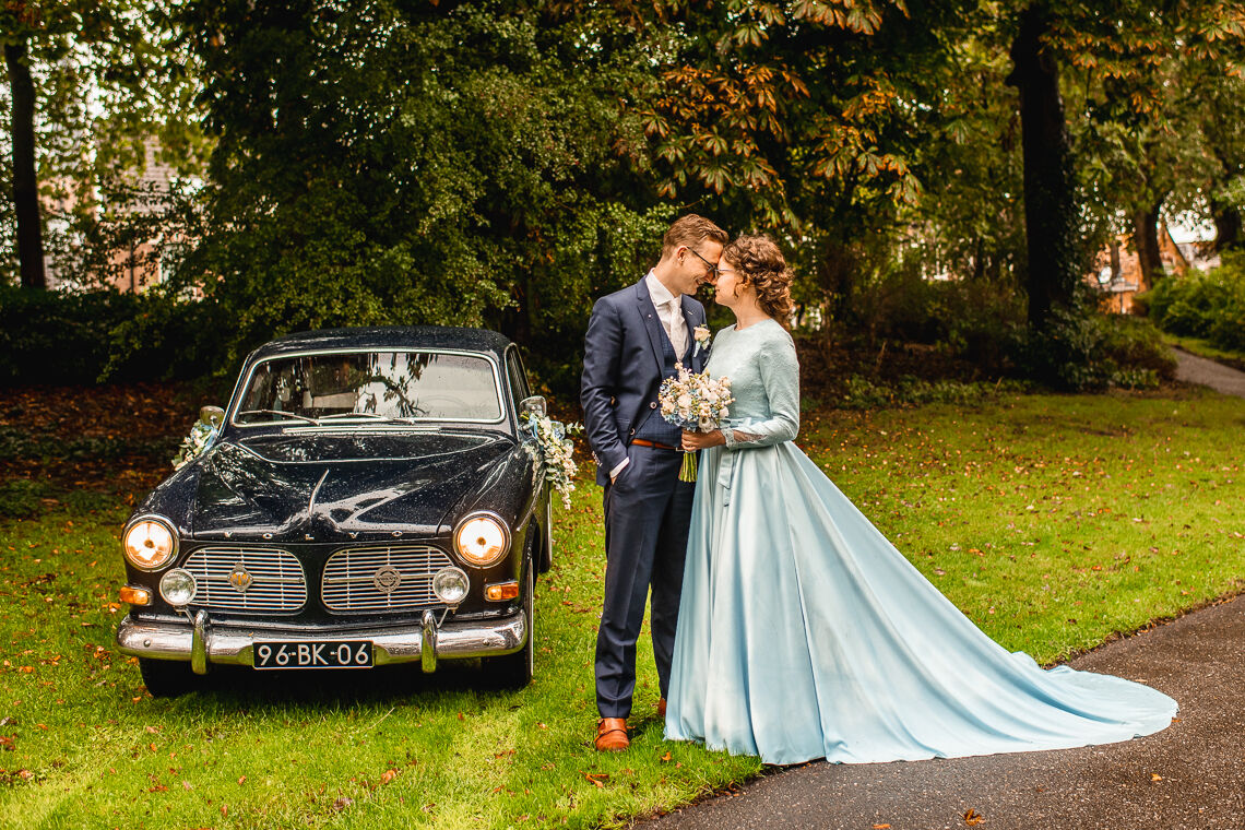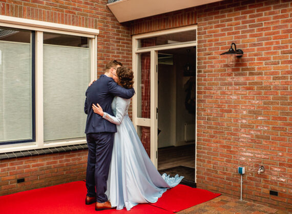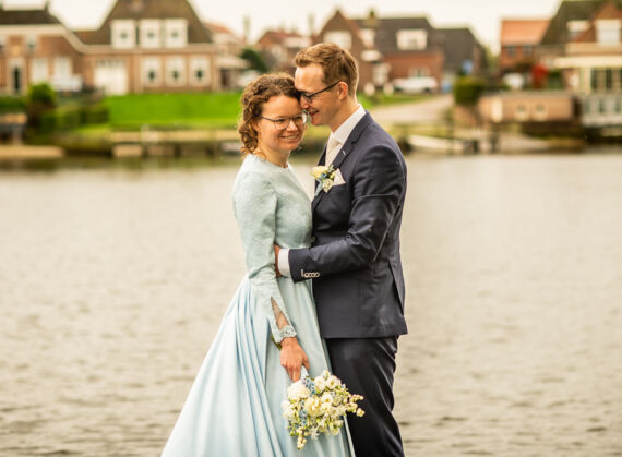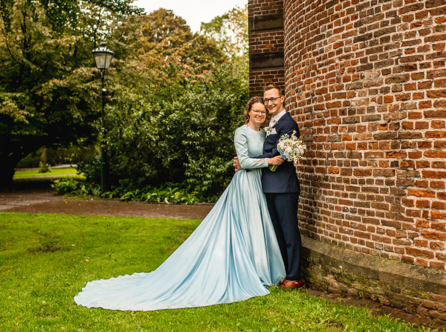 Reinier & Corine woonden zo dicht bij elkaar dat ik lopend van de een naar de ander kon. Ook wel eens fijn. Na de first look reden we in de regen naar Stadspark Kampen om daar foto's te maken en we hoopten dat het dan even droog zou zijn. Gelukkig was het droog toen we er waren. Het gras was wel erg nat, waardoor de jurk ook wel nat werd, maar dat vergeten we maar snel omdat het de hele tijd droog bleef! Daarna was de ceremonie bij 'Ons Erf' in Kampereiland, waar ook de lunch en bruidstaart was. De groepsfoto konden we ook weer buiten maken en gelukkig stonden we uit de wind.