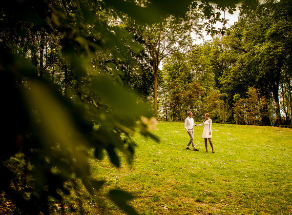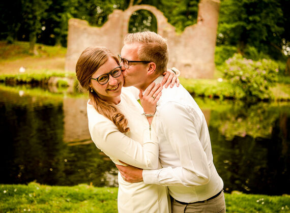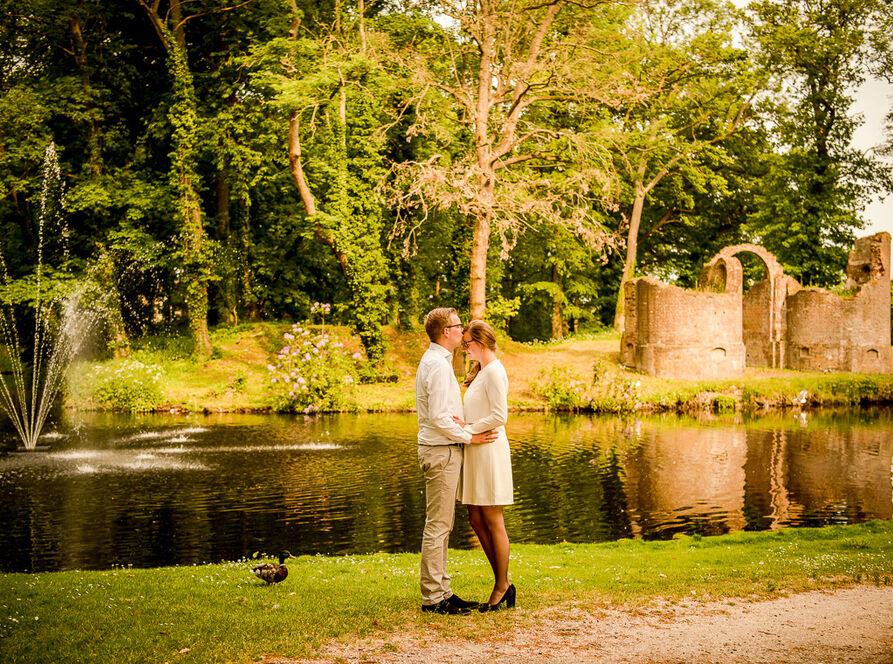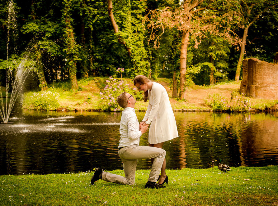 Bijna aan het eind van de loveshoot ging Hendrik steeds meer plekjes aanwijzen waar we foto's konden maken. Er waren ondertussen al heel veel foto's gemaakt. Ik stelde voor om bij een laan nog wat foto's te maken en daarna was de loveshoot klaar. Hendrik wilde toch nog op dat ene stukje gras met de ruïne als achtergrond, want dat moest volgens hem nog, dat vond hij zo mooi. Nou vooruit, ik vind het prima. Hij liep daarvoor nog even snel naar zijn jas en ik dacht: 'Ooo..zou hij haar ten huwelijk vragen?' Ik deed alsof ik niks door had, maar had de focus nog scherper op wat er te gebeuren stond. En ja hoor, na een aantal foto's ging Hendrik op zijn knieën! Het is zo mooi om dat vast te mogen leggen.